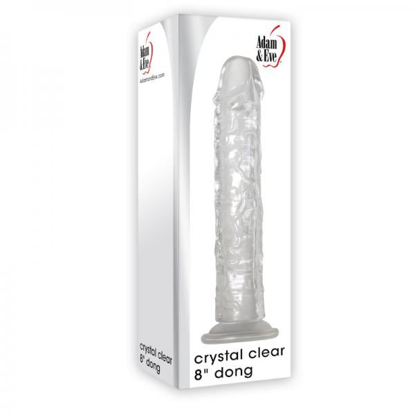 Play large and in charge with this deeply satisfying 8 inch dong. It's beautifully crafted phallic shape has generous length, girth, and all the thrilling textures you need for lifelike fantasy thrusting. A powerful suction cup base attaches to any smooth surface for hands-free ecstasy. 5 Year Warranty. Clean up is a snap with Adam & Eve toy cleaner and a warm water rinse. Waterproof & Submersible. COLOR: CLEAR@np2020-04